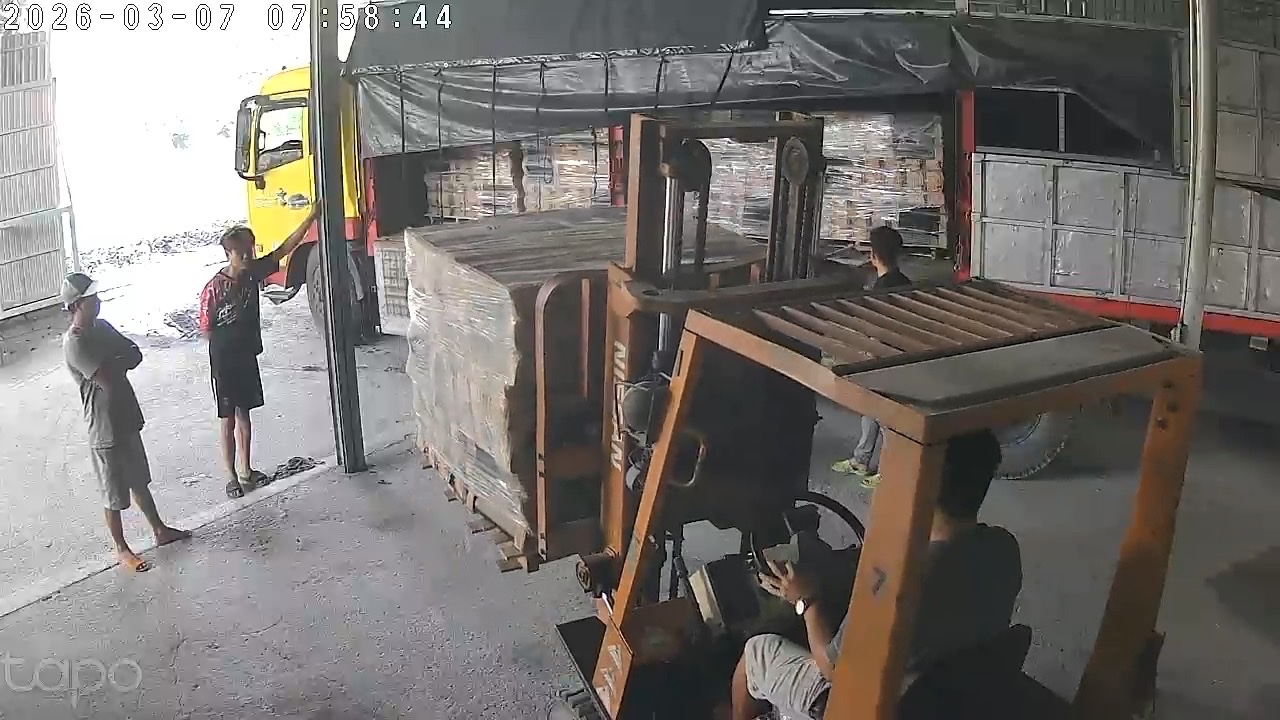 Sau khi hoàn tất kiểm tra, xe nâng được sử dụng để bốc các pallet ngói từ khu vực lưu kho lên xe tải vận chuyển.