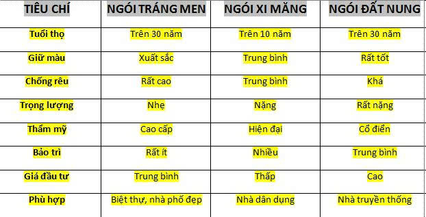 Bảng so sánh Tiêu Chí 3 dòng ngói lợp nhà